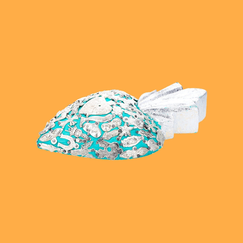 Wooden heart ex vota handmade in Mexico covered with typical devotional “Milagros” charms plated gold or silver depending on the color match, applied manually and nailed to the wooden base.